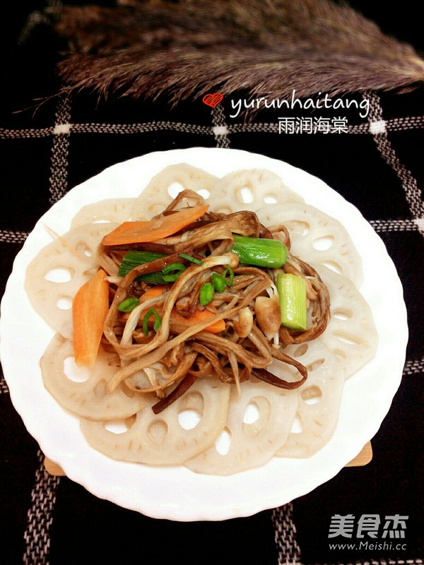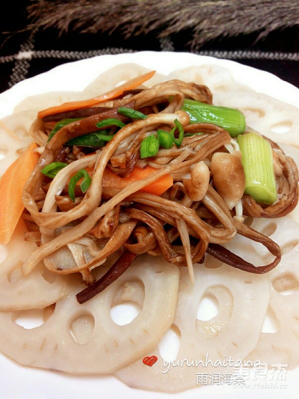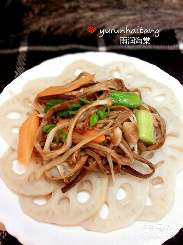 莲藕是一种营养价值很高的低脂食品,可以生吃,也可以蒸、炒、炖汤。金针菇对生长发育大有益处 ,两者结合在一起营养更加全面,家人很喜欢呢! 主料 金针菇200克 莲藕150克 辅料 花生油15毫升 盐1克 蒜苗30克 酱油10毫升 胡萝卜15克 金针菇炒藕片的做法 1.准备食材 2.将金针菇用水焯一下 3.莲藕焯一下 4.热锅放油,放入蒜苗爆出香味 5.放入金针菇翻炒几下 6.放入藕片翻炒几下 7.放入酱油 8.放入胡萝卜翻炒几下 9.加入盐炒匀即可 10.先将莲藕片摆入盘中,再将金针菇放在中间即可 烹饪技巧 莲藕切片后先用水泡一会,炒的时候要旺火快炒