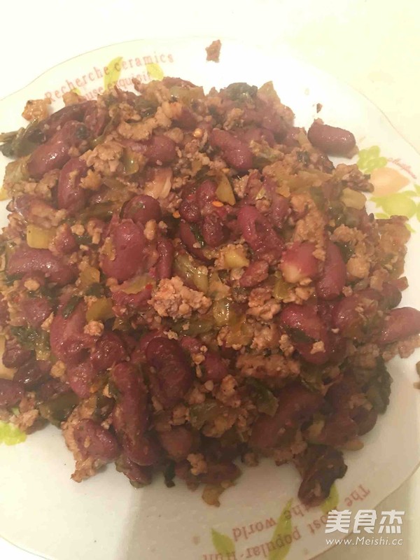 7.在刚刚翻炒的红豆里边再倒入肉沫,翻炒几分钟加入适量盐即可起锅。