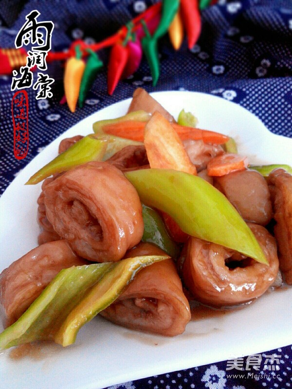 肥肠买回来后翻过来反复用食用碱和白醋搓洗干净,然后用水煮熟凉后切小段再炒,水淀粉要一点一点加入