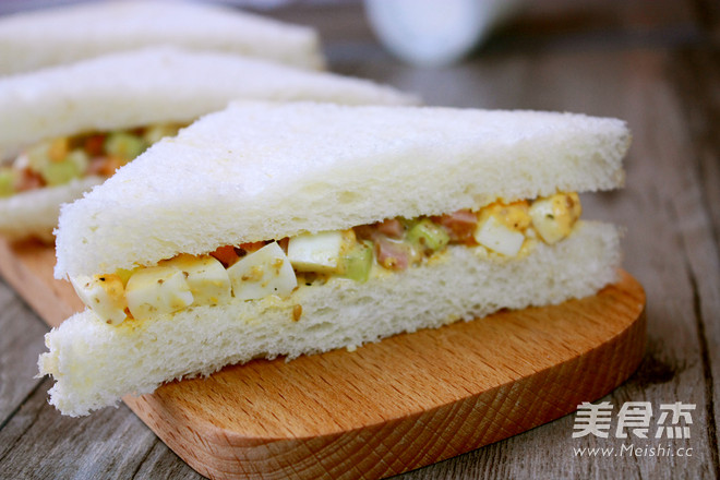 第一次看到这种三明治的做法是在日剧深夜食堂里面,从那之后这种三明治做法就偶尔会出现在我家的早餐食谱里面。三明治的材料可以很随意,水煮蛋自然是必不可少的,火腿和黄瓜则可随意,快手又美味,最适合匆忙的早晨了。