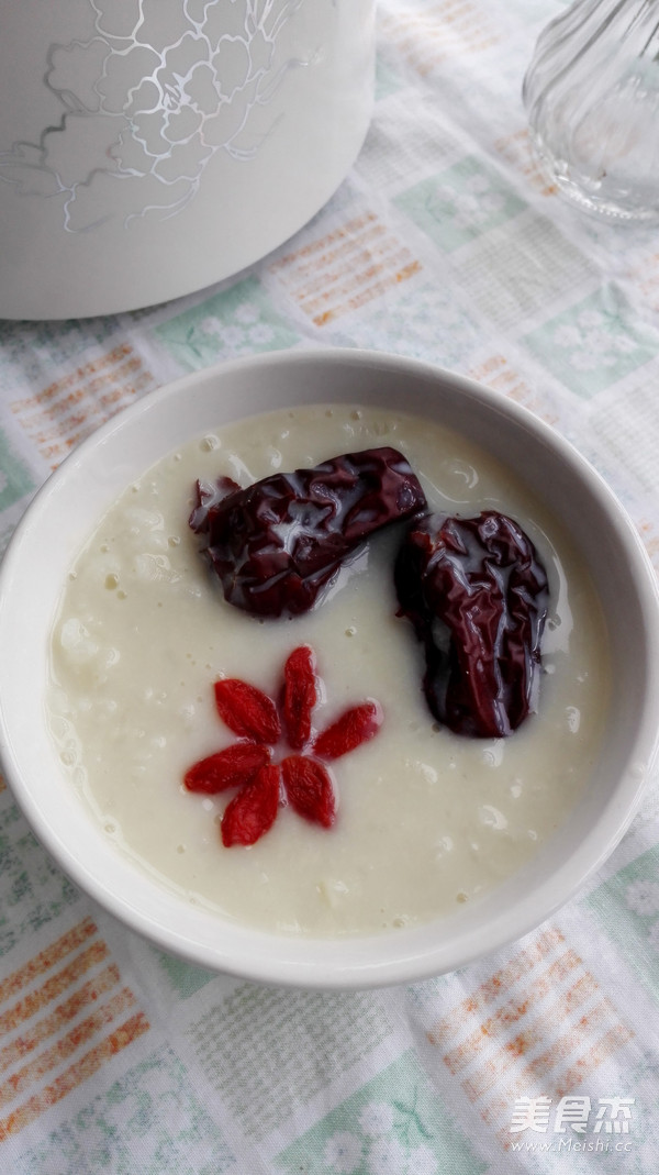 第一次用豆浆煮粥,营养更丰富哦 主料 豆浆200毫升 大米50克 红枣30克 枸杞6粒 冰糖10克 辅料 水300毫升 豆浆冰糖粥的做法 1.提前用豆浆机把豆浆做出,大米洗净,红枣和枸杞洗净 2.将豆浆,大米,红枣,水,放入锅中,大火煮开 3.转小火熬煮至浓稠,约半小时 4.煮好后,放入冰糖搅拌 5.装碗用枸杞装饰 烹饪技巧 按照喜好,厚稀可以自己调整水量