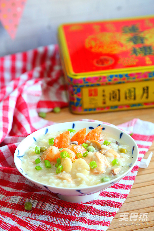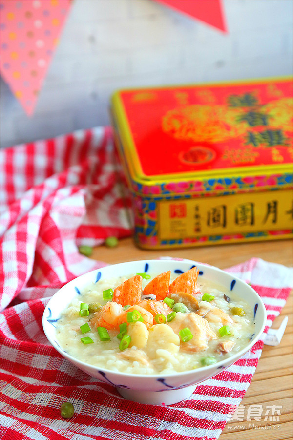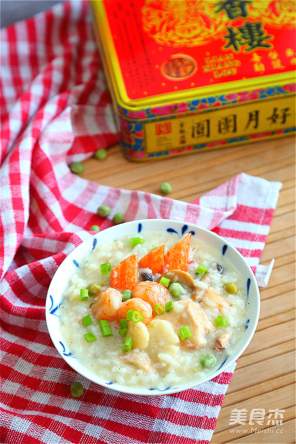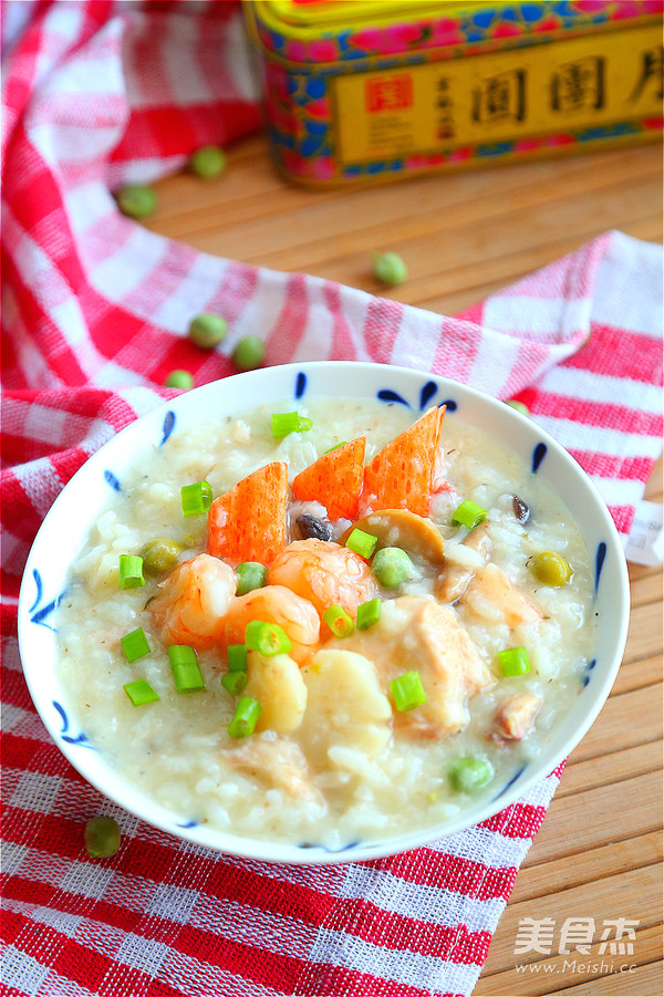 16.待粥快煮好时放入虾仁、扇贝、蟹棒再煮10分钟即可出锅。