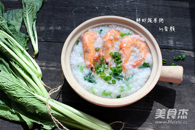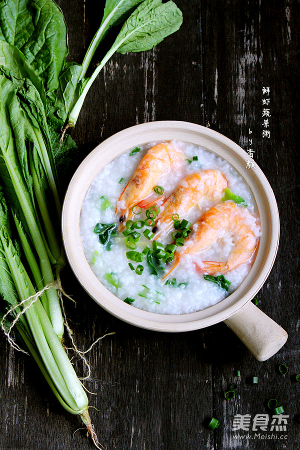 5.把虾,姜丝放入粥里,开着锅盖继续熬煮10分钟。 如果你的压力锅没有开盖熬煮的功能,那就把以上食材放入锅后盖盖继续五分钟,至时间到压力锅自行散气开盖即可。 到点后关闭电源,放入小白菜和小葱,酌情加盐和白胡椒粉调味,我加了两小勺盐和1/2小勺白胡椒粉,搅匀即可。
