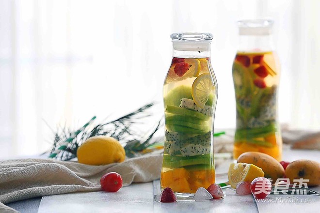 5.先把水果叠放在瓶子里,最后放入柠檬片和冰块
