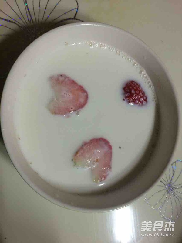 3.我家都不是每天现喝现买 而是批一两箱牛奶放到家里喝 但是不爱喝 所以不是每天喝 花钱了不喝也比较舍不得 牛奶放到锅里 放入草莓 然后喜欢甜一点的朋友们 可以放几勺白砂糖 或者几颗冰糖 牛奶一定要中小火 最好是白砂糖 因为冰糖化还要一段时间