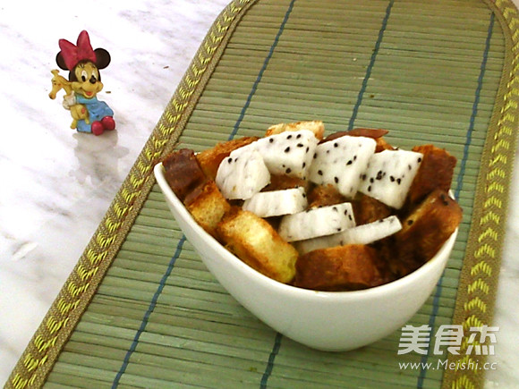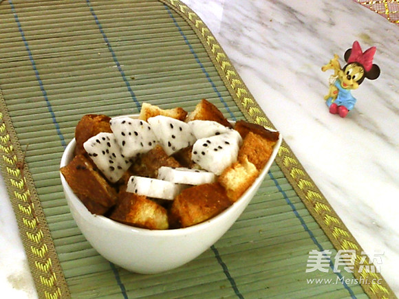 搜了半天,也没看见一道关于水果的面包布丁,无论是烤的还是蒸的。那就自己加点儿水果。水果太多,挨个儿想了一遍,换了若干种,按照不耐存放度,最后发现,必须立即马上解决掉的是那桌上的半个火龙果。没得选,火龙果面包布丁,蒸的,比较省事儿,省时。最重要的是,不费电。