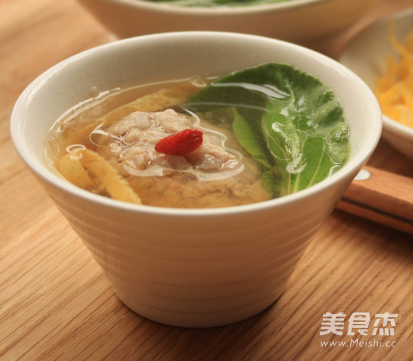 4.碗上加个盘做盖子,上锅大火蒸20-25分钟,调味加入盐,再蒸5分钟即可。全蛋液加些水,入不粘锅不加油,摊出蛋皮,切成条。 青菜叶烫下水,盛出肉圆,加上青菜和蛋皮。 盛碗饭可以开吃啦。