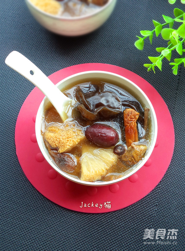 猴头菇10克 花菇10克 姬松茸10克 草菇10克 黑木耳5克 红枣20克 茶树菇10克 盐0.5茶匙