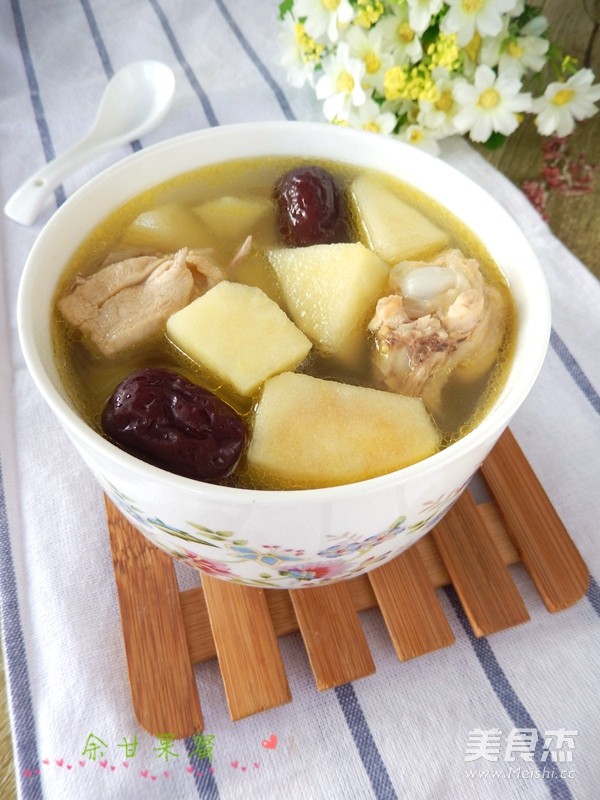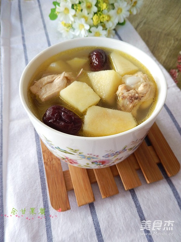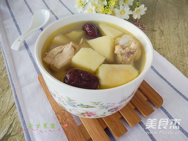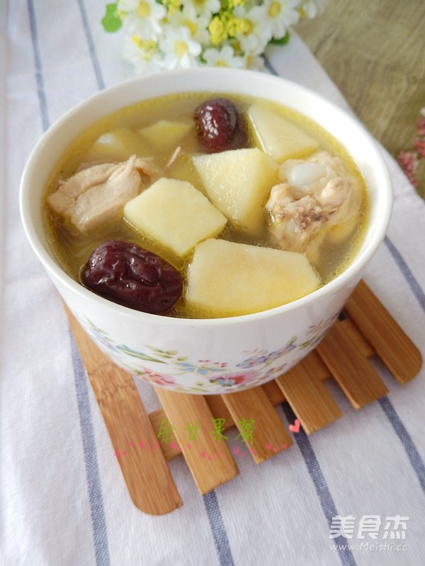6.鸡汤炖约1小时,加入苹果,稍煮一会,加入少许盐即可。