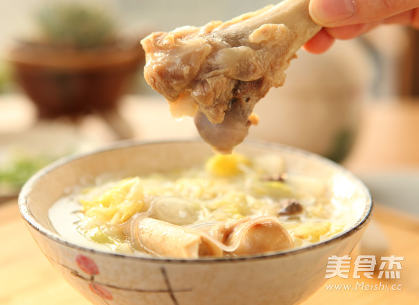 1.羊骨对半切开,入凉水锅中,加料酒、焯水后洗净备用。白菜洗净切丝儿备用。
