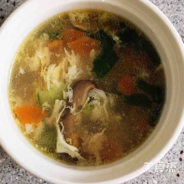 4.水烧开后加入黄瓜和绿叶菜,最后淋入鸡蛋液,再加入少许盐调味即可