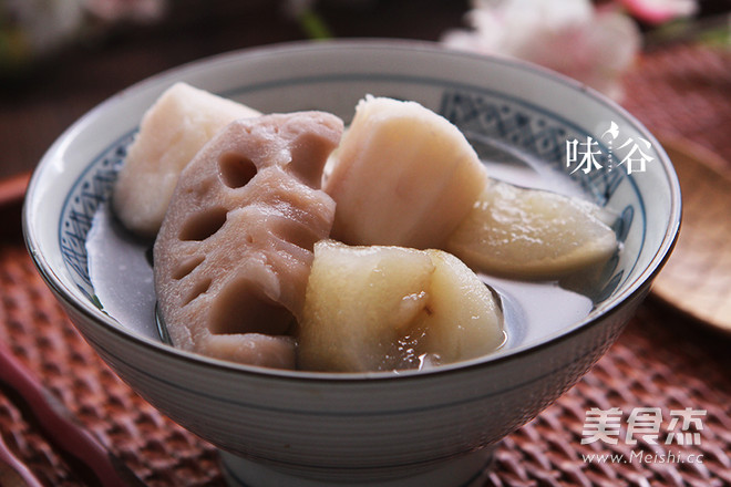 节后湿冷的感觉真是不舒服啊,这时候应该多吃一些津养阴滋润多汁的食品,中医认为白色食物多有滋阴润肺的功效,雪梨、莲藕、荸荠(马蹄)、山药都是润肺止咳的好食材,其中后三种根茎类的食材还有补足身体能量,加强免疫力,预防受寒感冒的功效,适合一家人饮用。 主料 莲藕300克 荸荠7粒 雪梨1个 淮山药150克 辅料 食盐适量 梨藕荸荠汤的做法 1.准备好所有材料。 2.将莲藕一大节和山药半根去皮切小块,雪梨切块,荸荠(马蹄)去皮。 3.将莲藕、山药和荸荠放入锅中,加适量的清水,大火烧开后转小火煮半小时后加入雪梨再煮10分钟。 4.出锅前加入适量食盐调味即可。