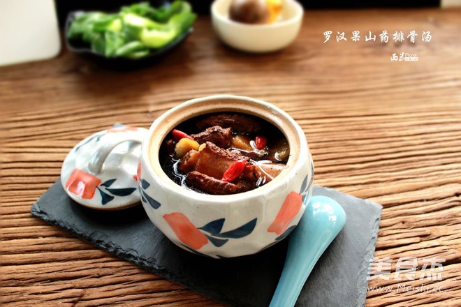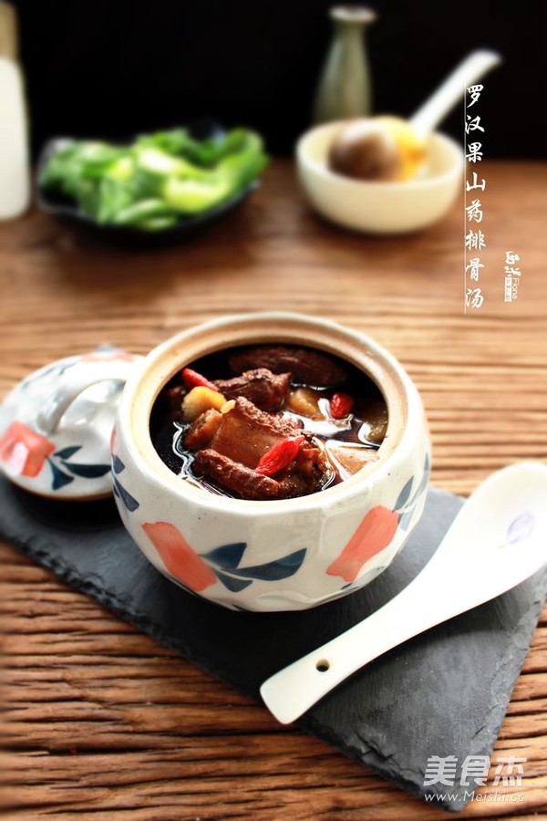 1.小排洗净,冷水下锅,烧开焯水三分钟。捞出洗净,山药去皮切片。罗汉果洗净切1/3个或是1/4个即可。