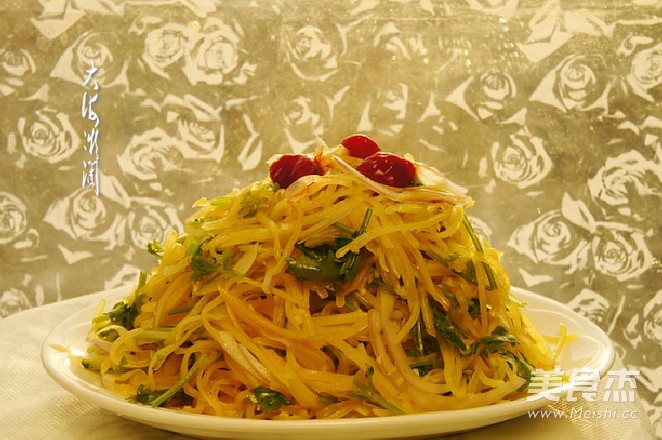 吃不够的家常菜,微辣,爽口下饭,自家餐桌不倒的招牌菜。 主料 土豆2个 辅料 油半汤匙 盐适量 毛葱1个 花椒1克 香菜适量 干红椒适量 大蒜适量 炝拌土豆丝的做法 1.备齐材料 2.毛葱切丝、香菜切碎 3.蒜切碎 4.土豆去皮洗净擦丝,冷水浸泡15分钟,泡出淀粉 5.过水焯一下 6.捞出过冷水,控净水分 7.菜盆加入土豆丝、洋葱、香菜、蒜碎、盐、白糖 8.热油锅爆香花椒粒和干红椒 9.倒入菜盆拌匀 10.装盘,OK! 烹饪技巧 1、喜欢辣味的可以将干红椒撕碎油炸; 2、土豆丝泡出淀粉,吃起来才爽口。