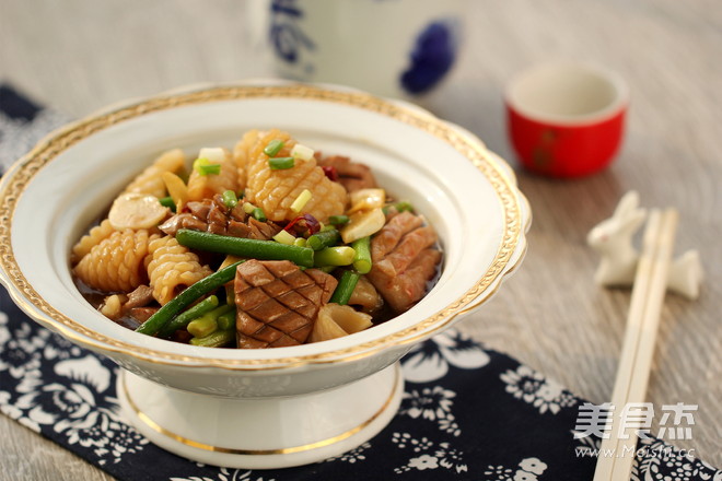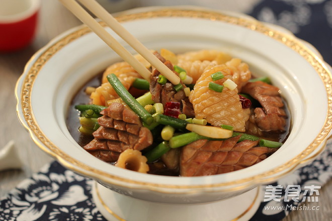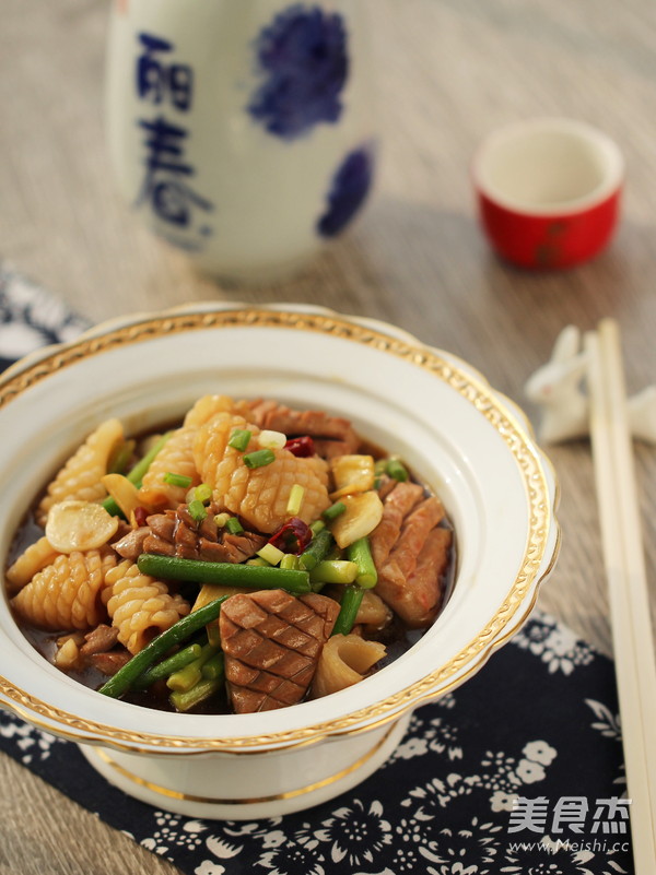 最后就是爆炒了,炒时搭配上新鲜上市的蒜苗, 为了保持食材的鲜嫩须大火快炒,注意火候,让汁均匀挂在食材上。