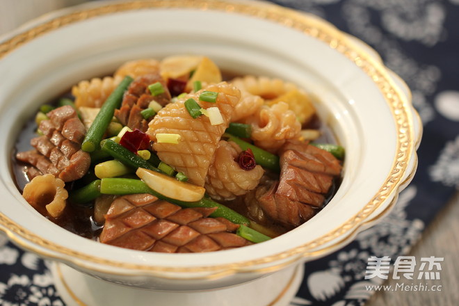 首先是鱿鱼和腰花的处理:鱿鱼先要除去表面的薄膜, 再打上麦穗花刀,切成小块,放入锅中焯水, 微微打卷后马上捞出;而腰花呢,一定要将肾上腺割除干净(也就是对切开来表面上的白色纤维膜),处理好后也同样打上麦穗花刀切成小块,这时我们可以放入适量的啤酒腌制一下去除腰花异味, 再去焯水, 腰花一变色后就要捞出;