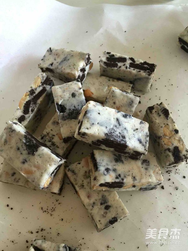 全程一定要用小火。 一定要冷却后切块,要不然会粘住刀。 奥利奥和花生的量按照自己喜爱添加。