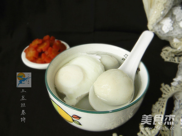 9.烧水,水烧到出现鱼眼泡的时候,先打一个鸡蛋,待鸡蛋成形,水在烧开,放入包好的汤圆,看到汤圆浮起,在小火煮2分钟即可