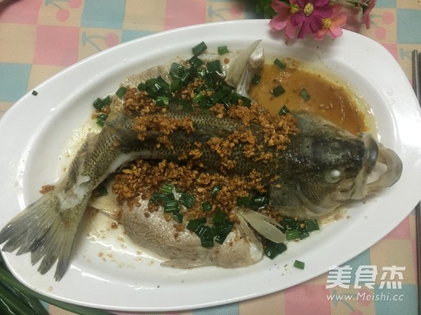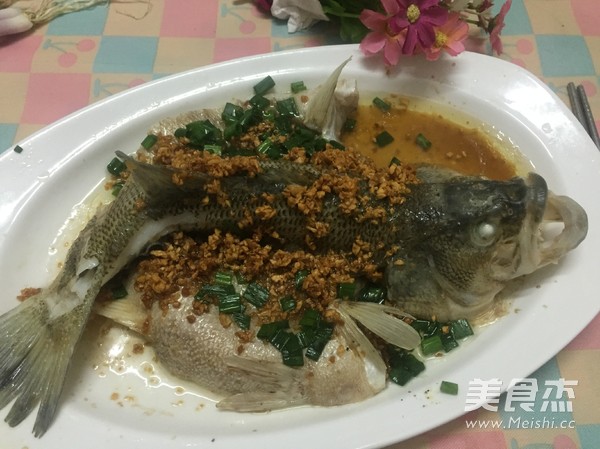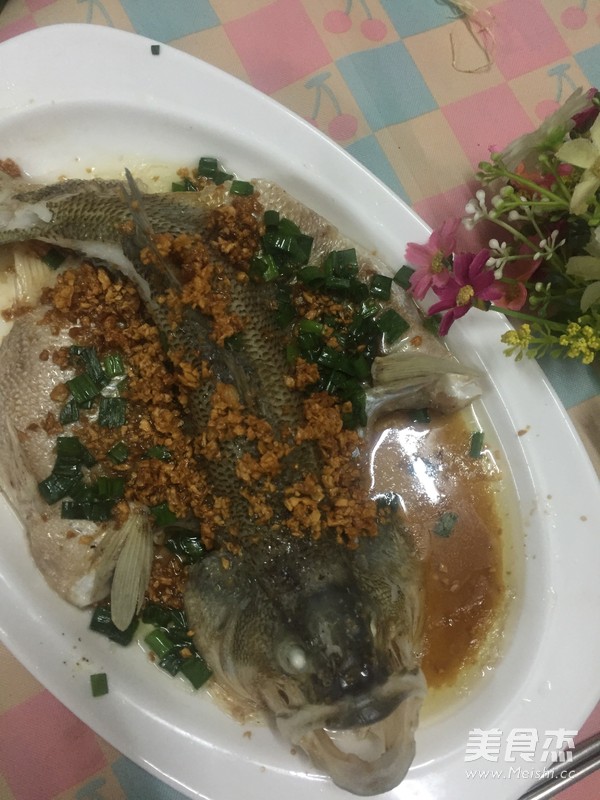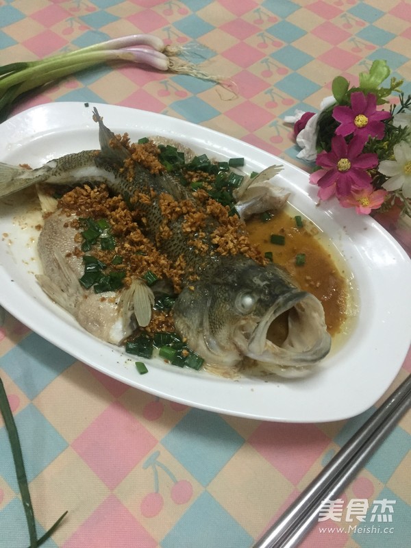 9.在蒸好鱼上加入葱花,把炸好的蒜蓉倒在鱼的身上