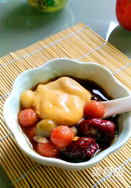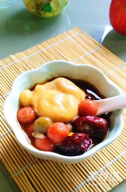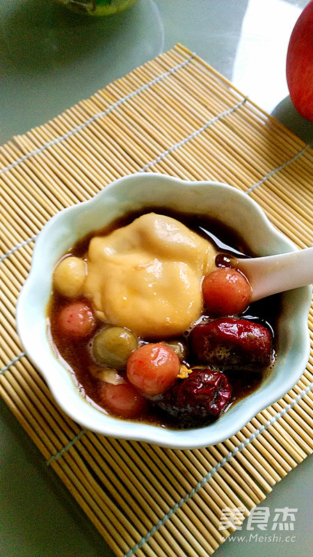 4.将鸡蛋磕开,直接打入高压锅中。等稍定型后,搅动下。放入红枣。我家的红枣是被我蒸熟了的,所以最后放。如果是没有加工过的红枣就要和汤圆一起放入煮比较好哦。