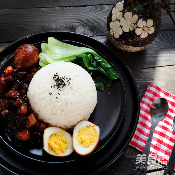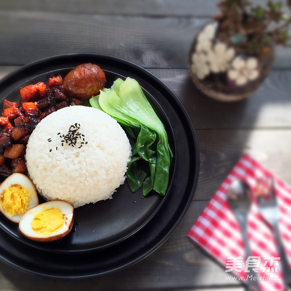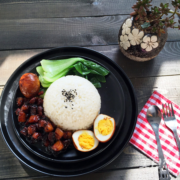 米饭1碗 五花肉250克 红葱头50克 香菇10克 土鸡蛋2个 油菜1棵