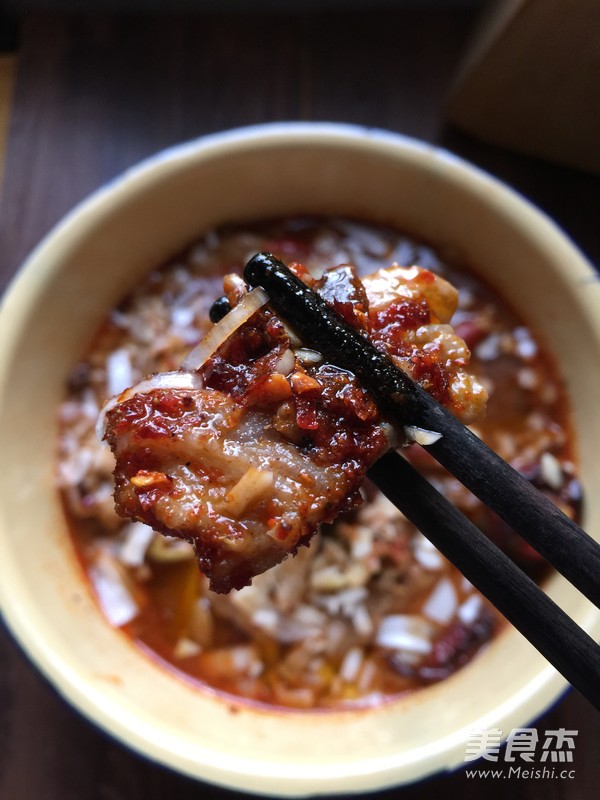 10.锅中烧少量热油,然后浇在辣椒面花椒蒜末上,激发出香味,完成。