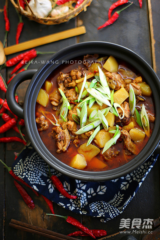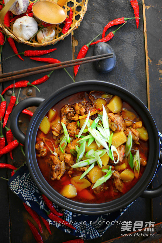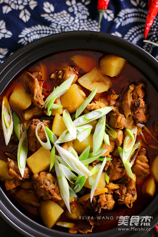 8.接着盖盖,转小火焖煮至鸡肉烂熟,出锅时撒些葱花即可。因为这里的配菜是土豆,就跟鸡块一起煮,如果放的是莴苣,就等鸡块焖好后再下莴苣煮至莴苣断生就可以了,因为莴苣是很容易熟的。