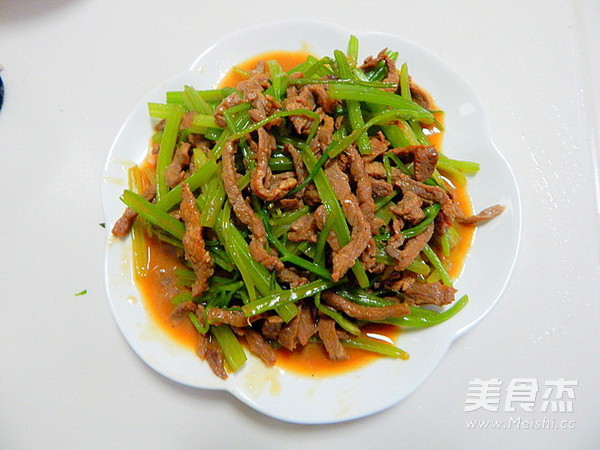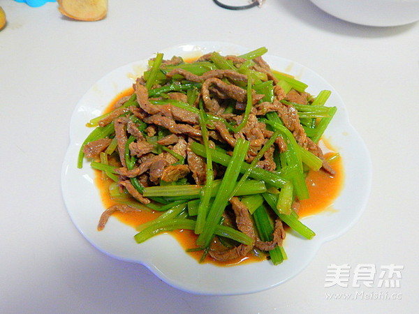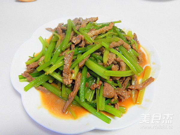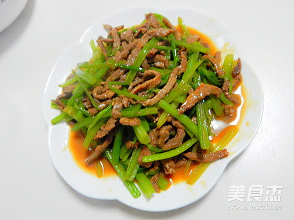 今天的芹菜比较新鲜就买了一些回来炒牛肉丝吃 主料 芹菜250克 牛肉300克 辅料 油8克 五香粉2克 料酒4克 淀粉2克 盐4克 生抽4克 芹菜炒牛肉丝的做法 1.牛肉 2.切成丝 3.加入料酒淀粉生抽 4.先抓匀 5.然后加入油再次抓匀腌半小时 6.芹菜清理干净 7.切好 8.锅里加入油加入腌好的牛肉丝 9.快速炒至变色 10.然后加入芹菜 11.大火翻炒均匀 12.在加入盐 13.在翻炒三分钟 14.加入五香粉 15.再次炒匀 16.出锅前加入鸡精炒匀 17.炒好装盘 烹饪技巧 一道相当的家常菜