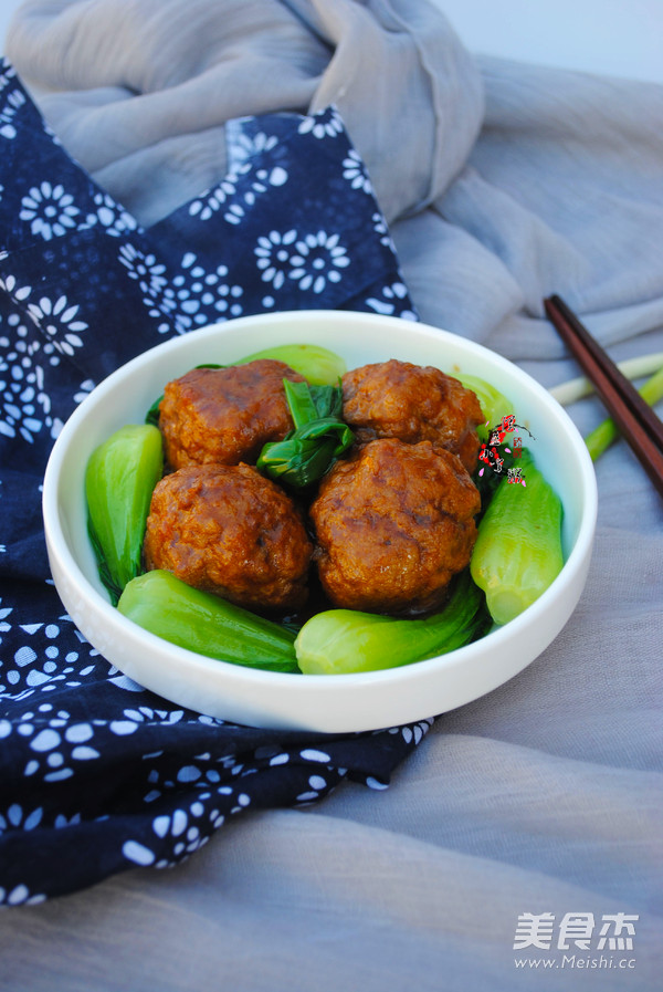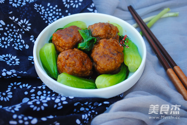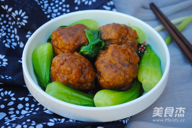 10. 油菜芯洗净,另取一锅烧水,水开后加油和盐,入菜芯汆熟后围在狮子头边上即可!