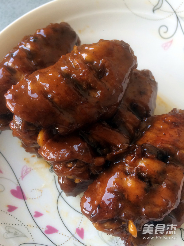 6.把鸡翅两面煎至金黄色后捞出。锅里留适量油,倒入少许花椒大料水,葱姜蒜,待炒出葱姜蒜香味后把鸡翅倒入锅中不断翻炒,倒入老抽,白糖