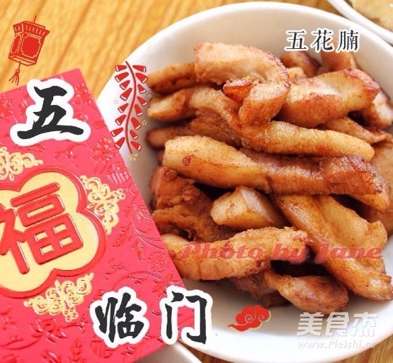 这是我们过年必要的菜肴 主料 五花肉500克 辅料 酱油30毫升 糖少许 新年菜五福临门的做法 1.五花肉整条洗净,水煮10分钟至肉熟,捞起晾凉,切成条状 2.肥肉先下锅,小火煸出油,猪皮朝上,否则像烧炮那样。 3.油已出来很多,可加入瘦的肉,爆至金黄后,将油全部盛起 4.开中火,加入酱油、糖翻炒即可!很香那!
