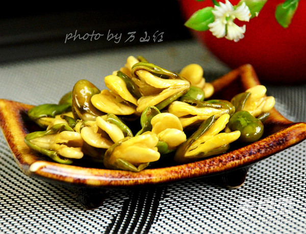 一般买的干蚕豆都是土黄色的,这个绿色的蚕豆还是新蚕豆上市是我亲自晾晒的。为了不使晒好的蚕豆也变成土黄色,我是特意剥了蚕豆的皮,放在通风的地方晒干的,稍微干了之后就移到阴凉通风处让其干透,以免一直太阳暴晒而失色,所以晒干的蚕豆也是绿色的,油炸后还透着些绿色。虽然味道依然是蚕豆的味道,但严冬季节,看着这绿色的蚕豆心里就舒服很多哩