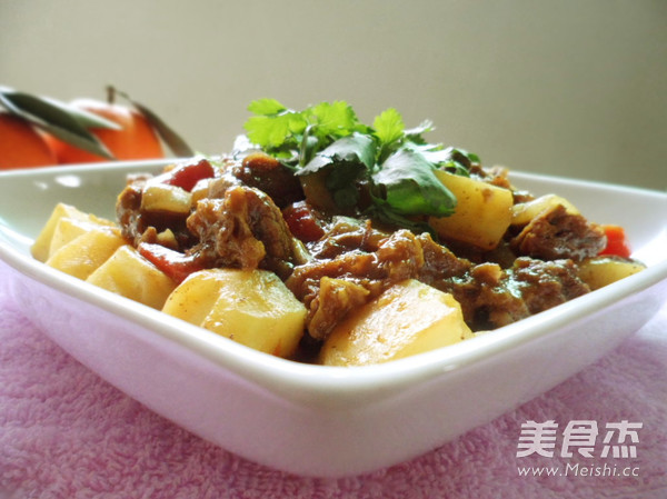 咖喱牛肉营养丰富,色泽金黄,咖喱香味浓郁,牛肉酥烂可口。 主料 牛肉500克 土豆150克 辅料 食盐5克 生抽15克 食用油10克 葱1克 姜1克 咖喱块5克 咖喱牛肉的做法 1.材料图。 2.牛肉放入高压锅中煮30分钟,洋芋放入锅中煮8分熟捞出。 3.热锅倒油,放入姜葱末炒香,放入牛肉干炒一下。 4.将洋葱、胡萝卜、盐、咖喱块放入,锅中注入煮过的牛肉汤。 5.煮5分钟后,加入土豆煮至熟即可。 6.出锅装盘。