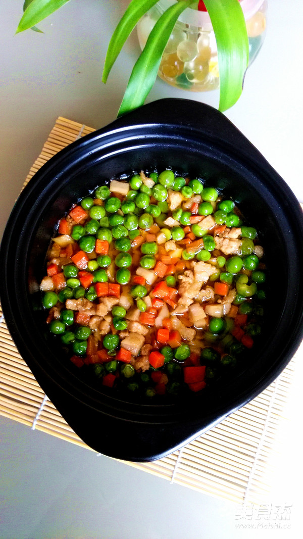 1.将材料准备好,麦豆买那种带壳的比较嫩,水分流失少。胡萝卜和莲藕切丁,姜切片,五花肉也切丁,事先用盐和酱油腌制下五花肉丁