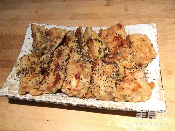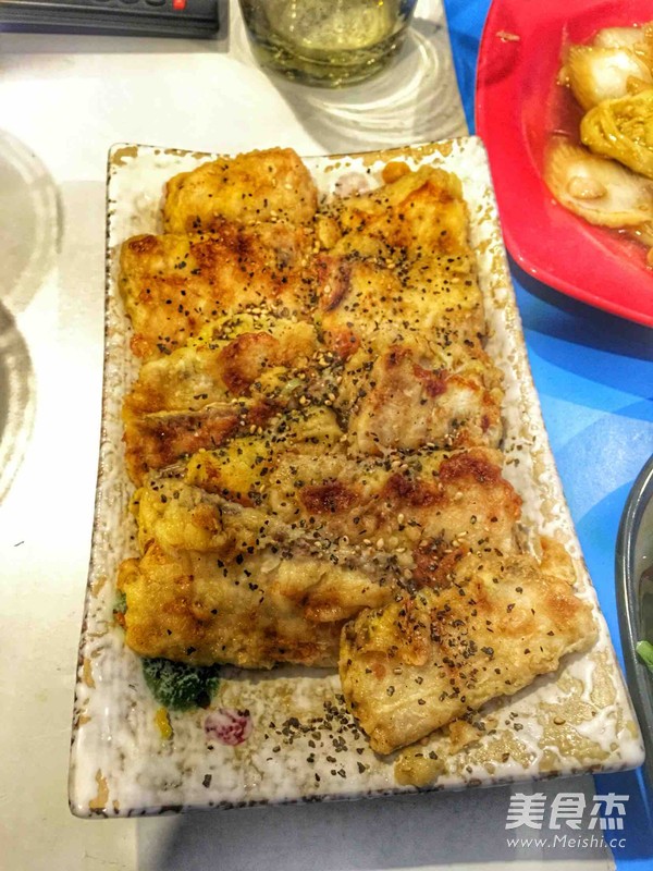 以前家里都是油炸带鱼但是太油腻 BF又喜欢吃黑胡椒所以就自创了这道 黑胡椒煎带鱼 主料 带鱼2条 黑胡椒适量 辅料 面粉1小碗 鸡蛋2个 葱适量 姜适量 料酒4勺 白酒1勺 盐适量 黑胡椒煎带鱼的做法 1.带鱼洗净 表面斜切3刀 2.放入 葱 姜 盐 料酒 白酒 黑胡椒 鸡精 抓匀 扣保鲜膜 腌制30分钟 3.带鱼段 在鸡蛋液里滚一下 然后再到面粉里打一个滚 4.电饼铛 加热 刷油 煎至定型 翻个 待两面金黄出锅 烹饪技巧 带鱼略腥 所以葱姜料酒要多放 盐可以稍微多一些 煎出来才好吃