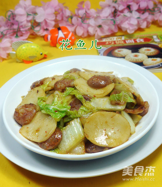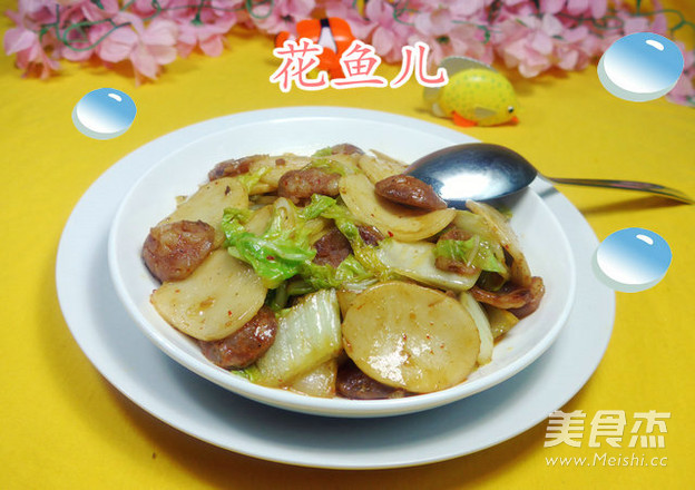 儿子的简单早餐。。。 主料 年糕170克 香肠(麻辣)50克 白菜120克 辅料 油3汤勺 牛肉酱1汤勺 生抽1汤勺 盐0.5勺 麻辣香肠白菜炒年糕的做法 1.食材:年糕片、麻辣香肠(已切片)、白菜(已清洗切开)、牛肉酱 2.取平底锅置火上加入3汤勺油烧热,下入切好的麻辣香肠翻炒翻炒。 3.接着,合入切好的白菜翻炒翻炒至断生。 4.然后,合入年糕片翻炒翻炒至软。 5.最后,加1汤勺生抽。 6.加0.5勺盐。 7.加1汤勺牛肉酱。 8.调味炒匀,即成。