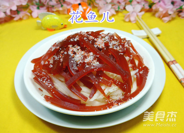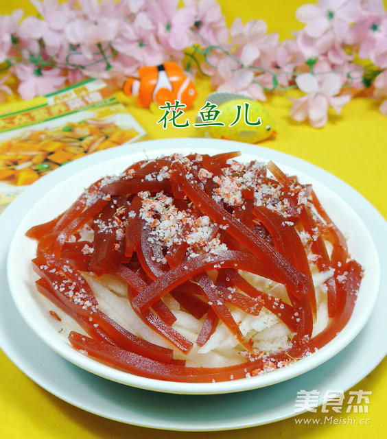 山楂糕就是一种酸味食品,又称京糕,色泽鲜艳,光亮透明,表面光滑,含有较多的有机酸、果胶、维生素C,营养丰富。 梨清凉润胃还解酒,梨虽然甜,但热量却很低,极适合爱吃甜又怕胖的人食用,吃个梨能清凉润胃,因为梨含有较多糖类物质和多种维生素。 主料 山梨1只 京糕130克 辅料 糖桂花适量 桂花京糕梨丝的做法 1.食材:砀山梨、京糕、糖桂花 2.将京糕放在案板上切成丝,待用。 3.将砀山梨去皮,放在案板上切成丝。 4.接着,将切好的砀山梨和京糕放入盘中。 5.然后,搁入适量的糖桂花,即成。