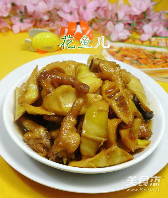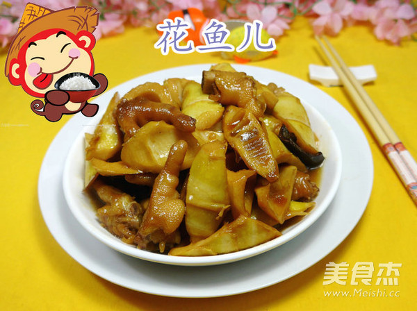 7.接着,合入剁好的凤爪,搁入桂皮和大料翻动一下。