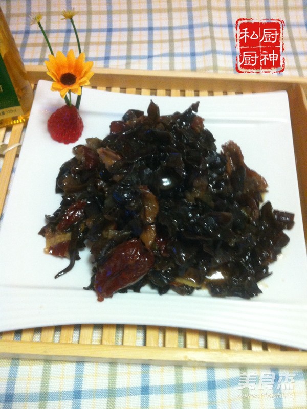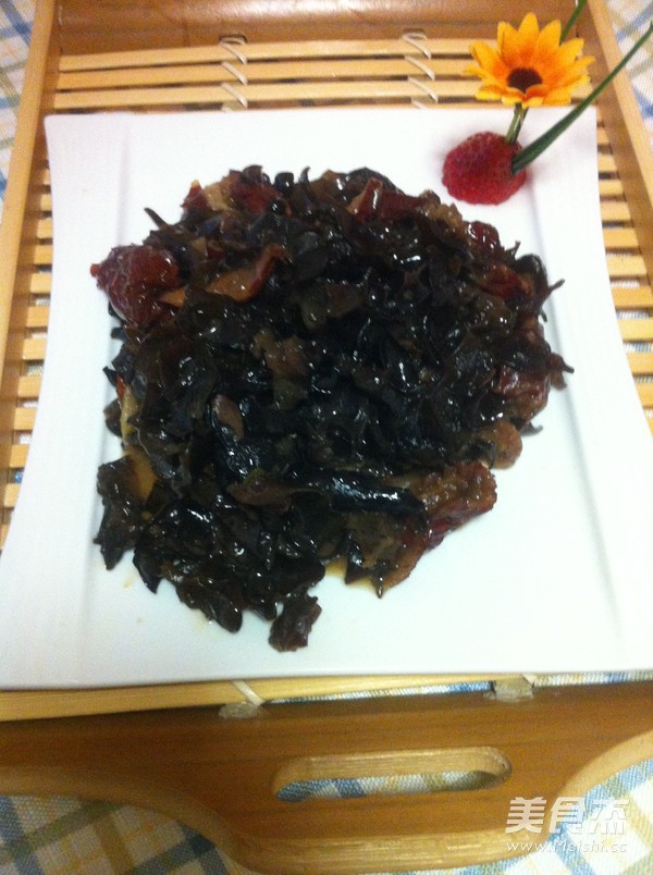 清肺热,养胃肝阴,滋肾燥,可增加人体免疫力功效。 主料 木耳(水发)250克 红枣10个 辅料 盐2克 香油适量 水100毫升 姜2克 葱2克 淀粉少许 红枣炒木耳的做法 1.木耳水发洗净切丝, 2.红枣去核, 3.姜切丝,葱切丝, 4.锅里放少许山茶油煸炒葱姜, 5.放木耳煸炒加水, 6.放红枣焖烧片刻后放盐香油勾芡即可。 烹饪技巧 枣要去核,