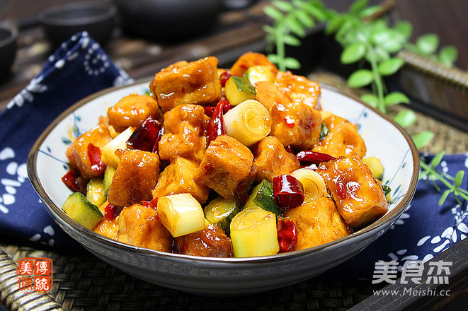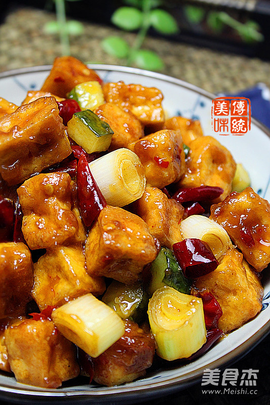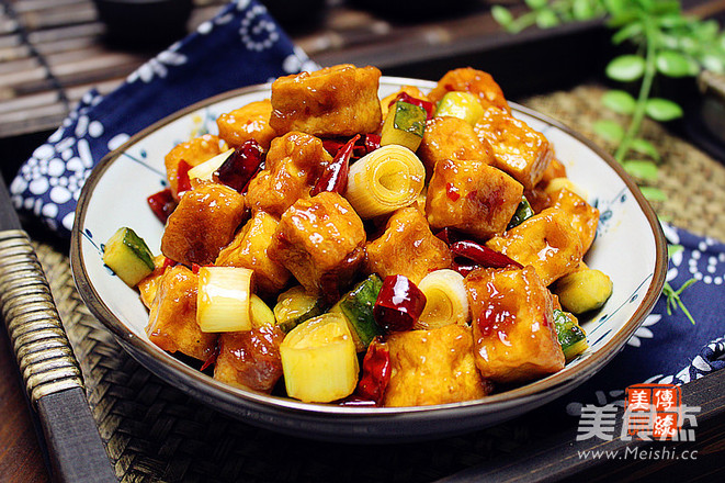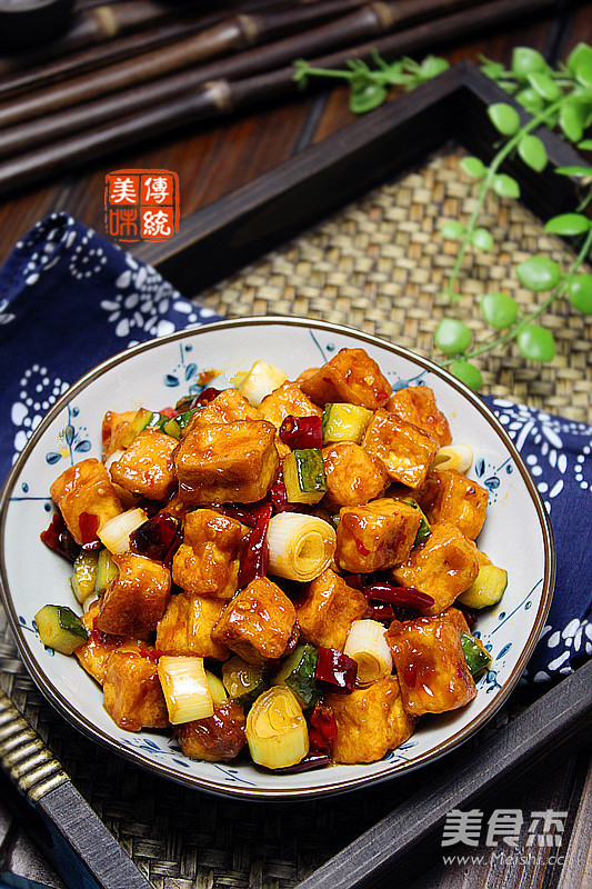豆腐的做法有很多种,这道宫保豆腐是从宫保鸡丁演变而来的,只是将鸡丁换成了豆腐。另外,我为口感更加清爽,特意将花生换成黄瓜。这道菜色泽红润,味道鲜辣甜香,是一道非常下饭又易做的家常菜肴。