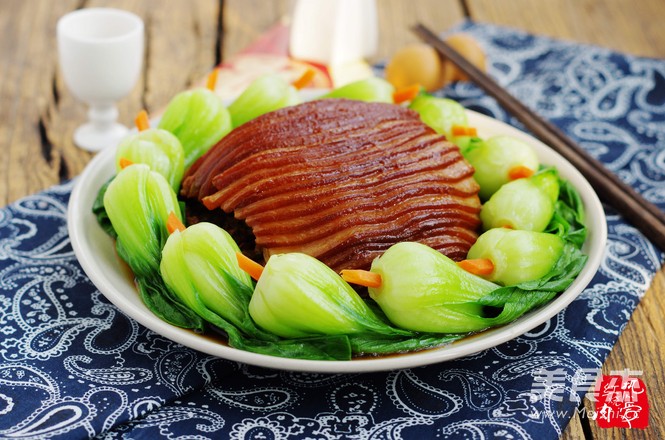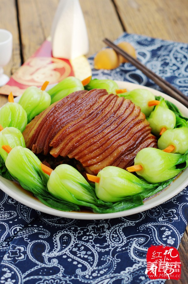 24.将蒸好的肉从电饭煲内取出,焯好的油菜也准备好,然后找一个合适的盘子,把肉扣出来,再把油菜摆放在肉的四周,端上桌开吃喽!