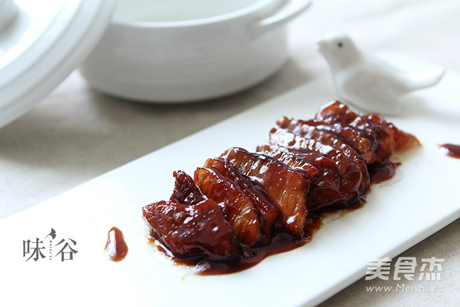 3.锅底刷一层油,碗内的肉和酱汁倒入锅内,放上冰糖,再倒入水,浸没到肉的一半就行。按煮饭键,中途打开几次把肉翻面,让肉均匀沾上酱汁,待酱汁产差不多收干便可以起锅切片。