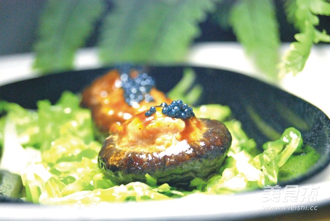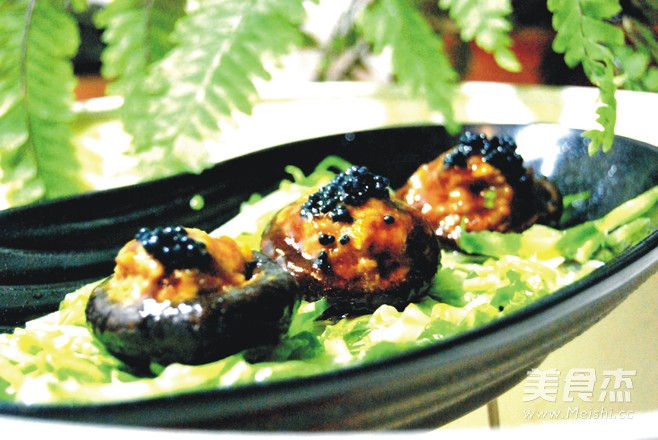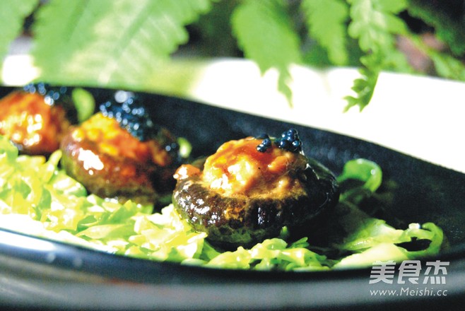 9.装盘,盘底放炒熟的包菜丝,上面放肉酿香菇,顶上放少许的鱼籽酱就可以上桌开吃啦
