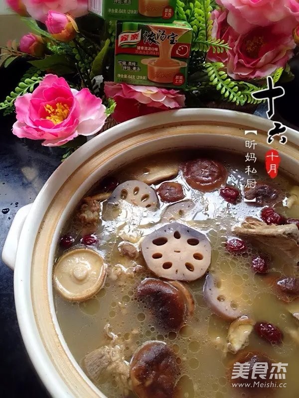 8.然后把蘑菇入锅,让蘑菇饱饱的吸取汤汁。大约再熬一个小时,骨酥肉软,藕粉蘑菇鲜