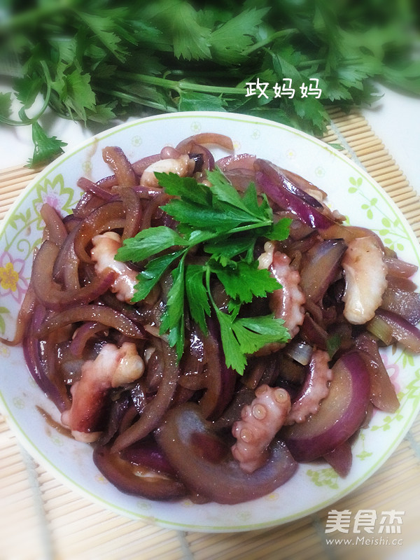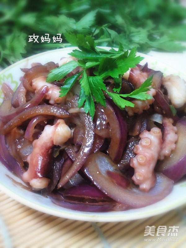 家常菜---洋葱炒章鱼 主料 章鱼2只 洋葱1个 辅料 油2勺 味极鲜酱油0.5勺 蚝油0.5勺 盐适量 洋葱炒章鱼的做法 1.章鱼洗净切成小段 2.洋葱洗净切成丝 3.锅里油热炒香葱花,加入章鱼炒一炒 4.加入洋葱翻炒一会 5.加点味极鲜酱油继续翻炒 6.加点蚝油继续翻炒至洋葱断生,加点盐调匀即可。 烹饪技巧 切洋葱的时候会辣眼睛,可将洋葱切成两半后用清水泡一泡,会缓解