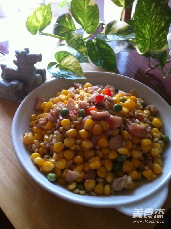 4.锅内放油烧到四成热下鱼丁煸炒香味放葱蒜炒岀香味后放玉米粒,豌豆炒三分钟后放红椒,盐,最后放松仁香油即可。
