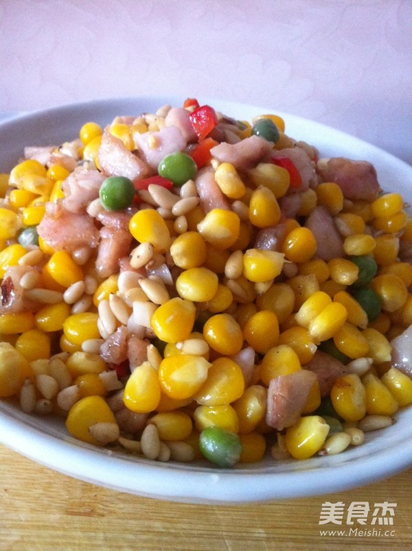 鱼肉200克 玉米250克 豌豆10克 红椒10克 松仁20克