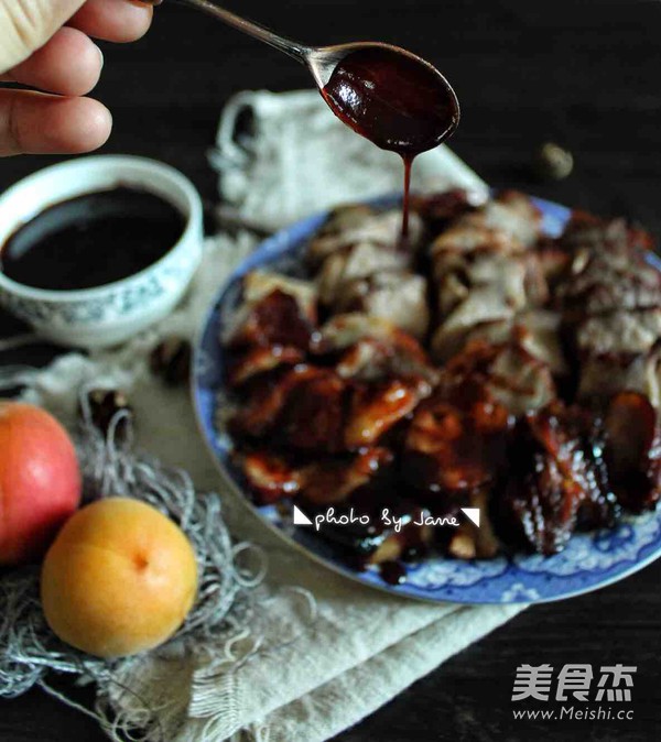 4.腌肉的汁和烤叉烧流出的。油汁,加200ml水和1勺蜂蜜,煮至稠即可,用于点沾叉烧。