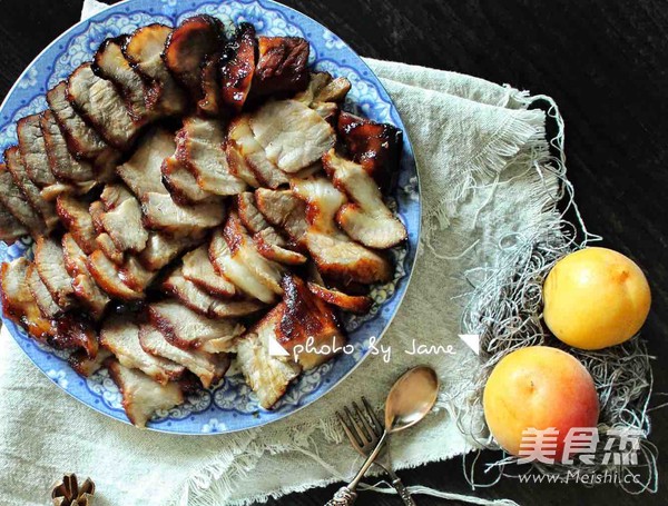 3.用叉烧酱、柱侯酱、海鲜酱拌匀,涂抹在猪颈肉上,我洒了些干罗至叶,腌一晚上,如果没时间至少腌2小时。入烤箱,汁不加入,200度烤20分钟,反面再烤20分钟,刷上蜂蜜烤5分钟,反面刷一次烤5分钟。出炉晾凉切片