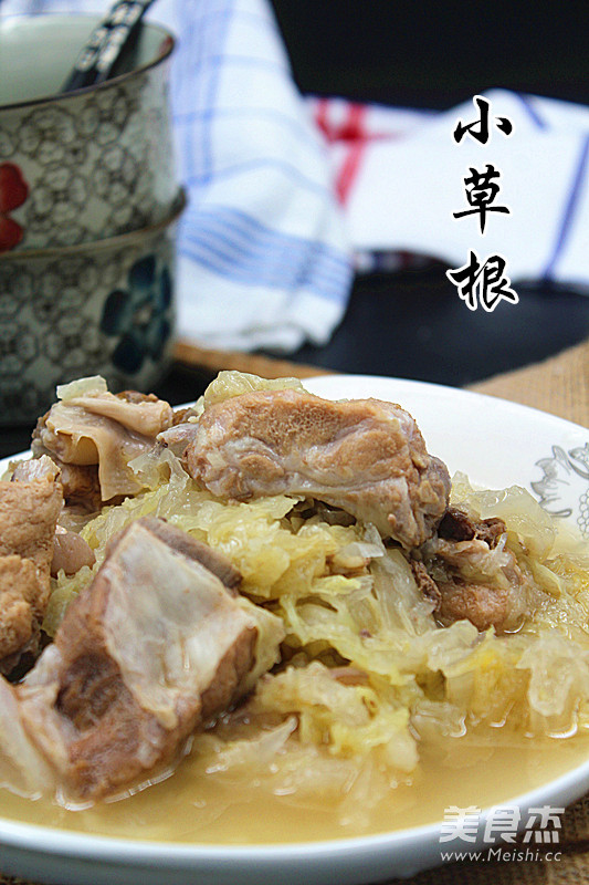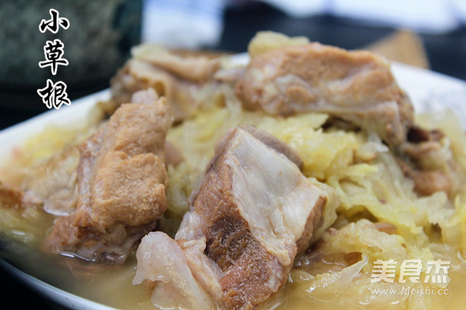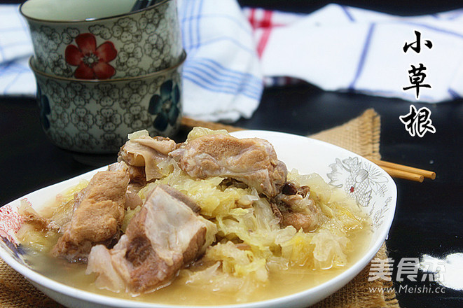 6.排骨五分熟的时候,将酸菜加到排骨里面,继续炖,酸菜不怕炖,越炖越好吃,快熟的时候,加盐,关火加鸡精